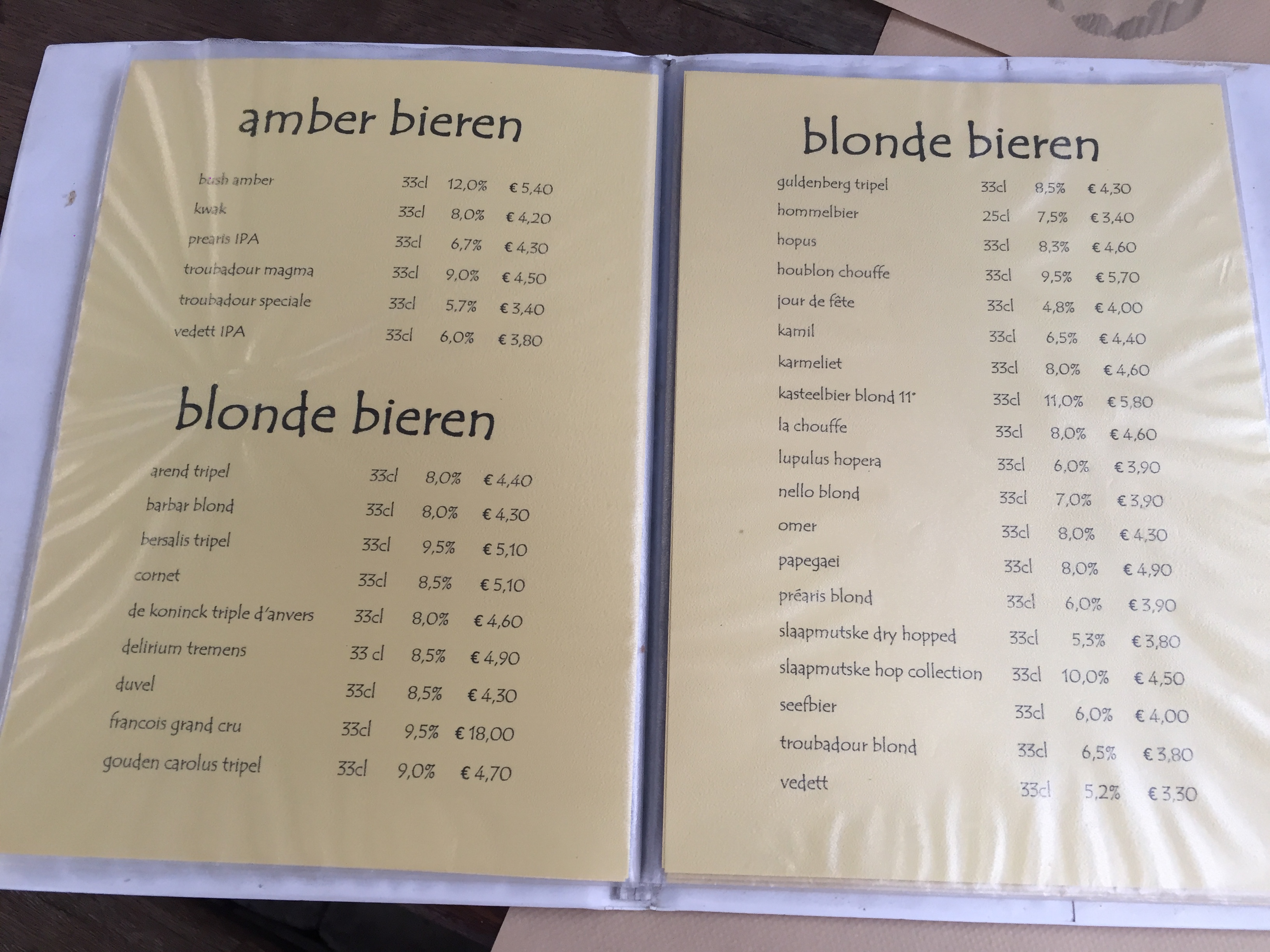 I am a different Kettle of Fish, I eat everything. I am an Omnivore. Specialising in Offal. So Europe, here Belgium, is good to me, and after devouring a couple of plates of Raw Something, and a couple of different ways of presenting Herrings, I moved to the Beer Menu. Yes, a Beer Menu.