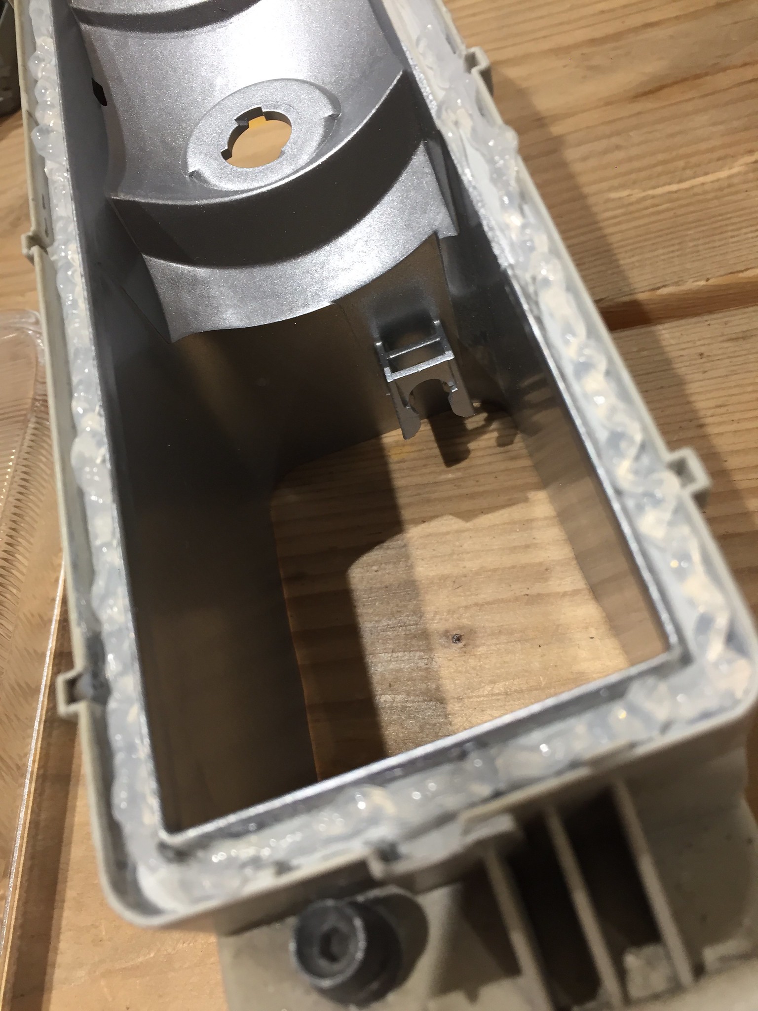 Mask off the channel that the lens sits in, as you will be applying adhesive here; you need to ensure that the lens glue gets a good and direct purchase to the plastic housing.