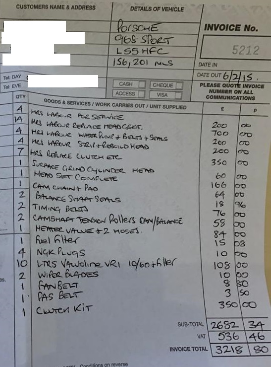 Another aspect of the 968 that I started to contemplate is the age of the Head Gasket. None of the Tell Tale signs of trouble were apparent, but something I wanted to confirm all the same. I contacted the chap I bought the 968 from who was more than happy to allay my fears. This is evidence that it really is a good idea to keep in touch with the Seller; they know things about the Car that, yes you could find the Paperwork for, but they commissioned the work, they paid for the work, and they will remember Big Bills..