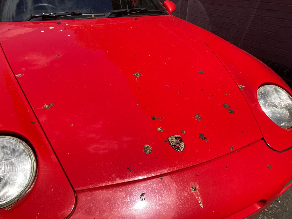 Neighbours have told me, and yet I forgot. The Trees that line the Street around the corner [where most of the Residents Parking spaces are to be found] are renowned for hosting Pigeons, as well as dropping Sap in buckets. As sure as lying down with Dogs getting you Fleas, parking under one of these Trees gets you the Birds, and after a week the 968 looked like a Barn Find..