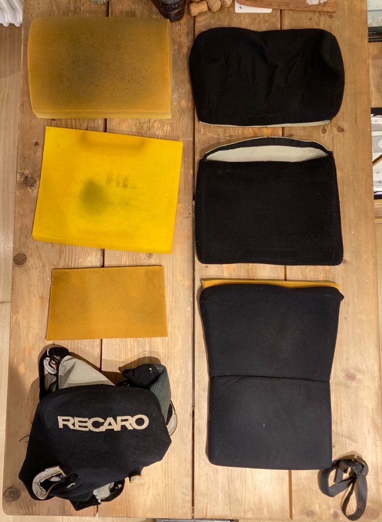I used to work in Angel Islington in London for a couple of years, and, commuting to work by Bike, I would sometimes pick a route that would see me cranking up the Pentonville Road, past Pentonville Foam & Rubber. You can imagine [or not] my excitement at discovering I needed to go to this Shop to source replacement Foam for the Recaros; it was almost a Dream come true. Or perhaps a second thought. Either way, taking a sample to the Shop, and then having a piece cut large enough to cover all the individual pieces required, cost a bargainous £16.