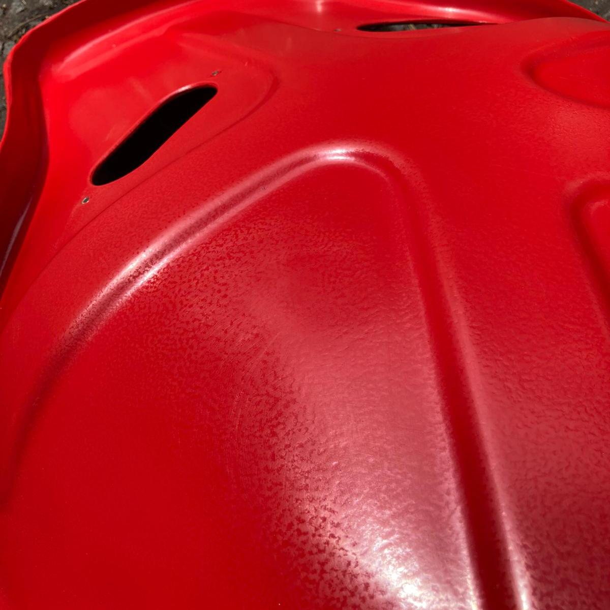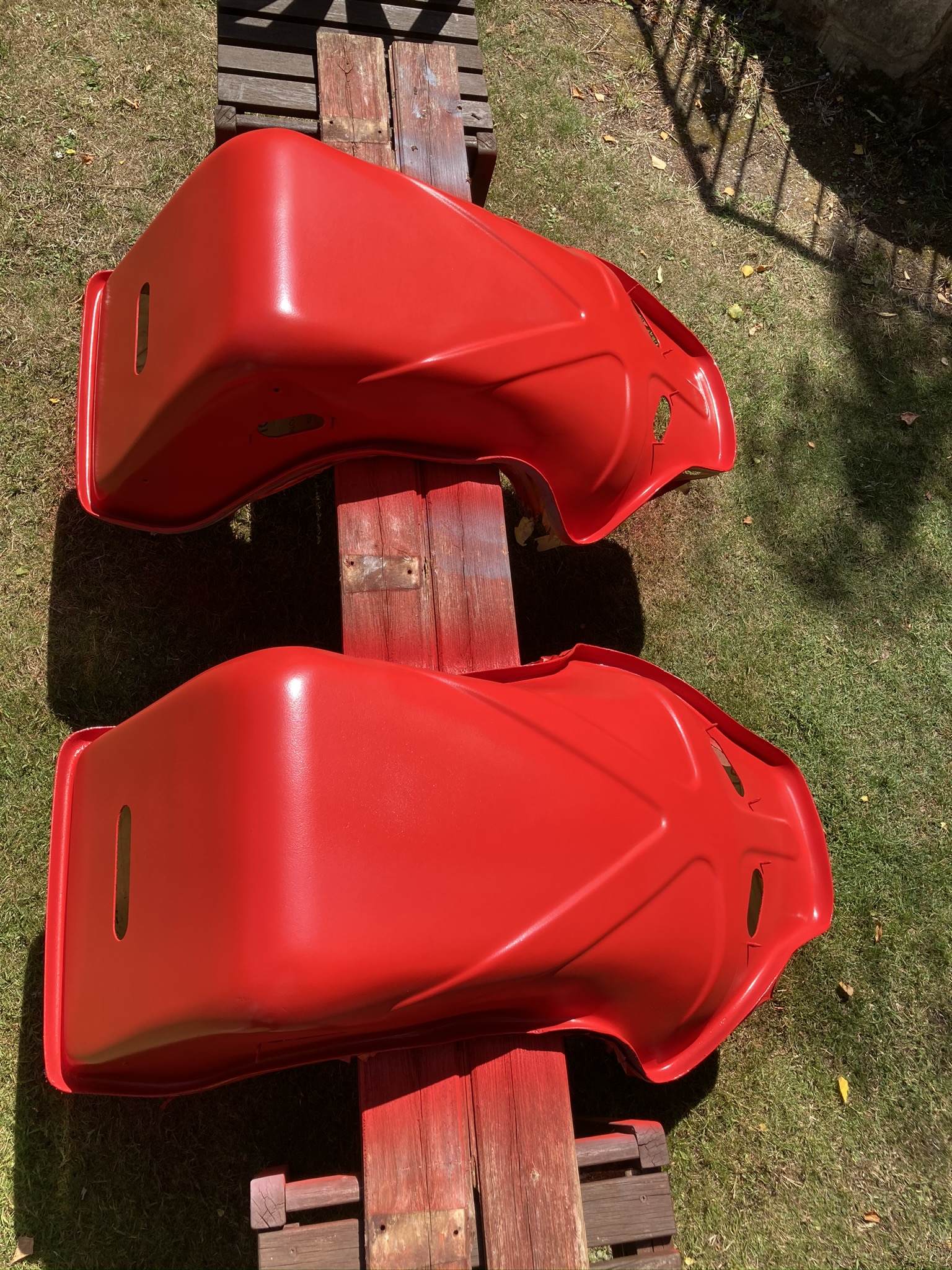 Second trip down South, it was time for the Top Coat, and the Weather turned on again making it perfect for an outdoor job. I discovered that in fact my Dad had applied 3 Coats [!] of Primer to the Recaros, rubbing down each time. They looked fantastic, and ready for Red. Opening the tin, the Guards Red was so bright, almost glowing in the Summer Sun.