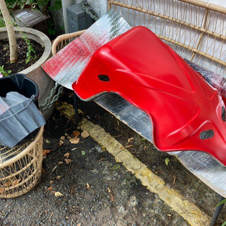 When it comes to the Primer, masking up is not really necessary, but thought I’d limit the amount of overspray to the inside of the Bucket, to which the Foam would need to be glued.