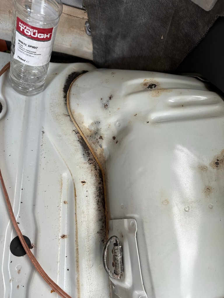 Since I knew the underside of the Inner Wheel Arches was solid this was just a case of Rust Converting the Surface Rust. Hammerite’s Kurust [Cure Rust, geddit..?] to the rescue.