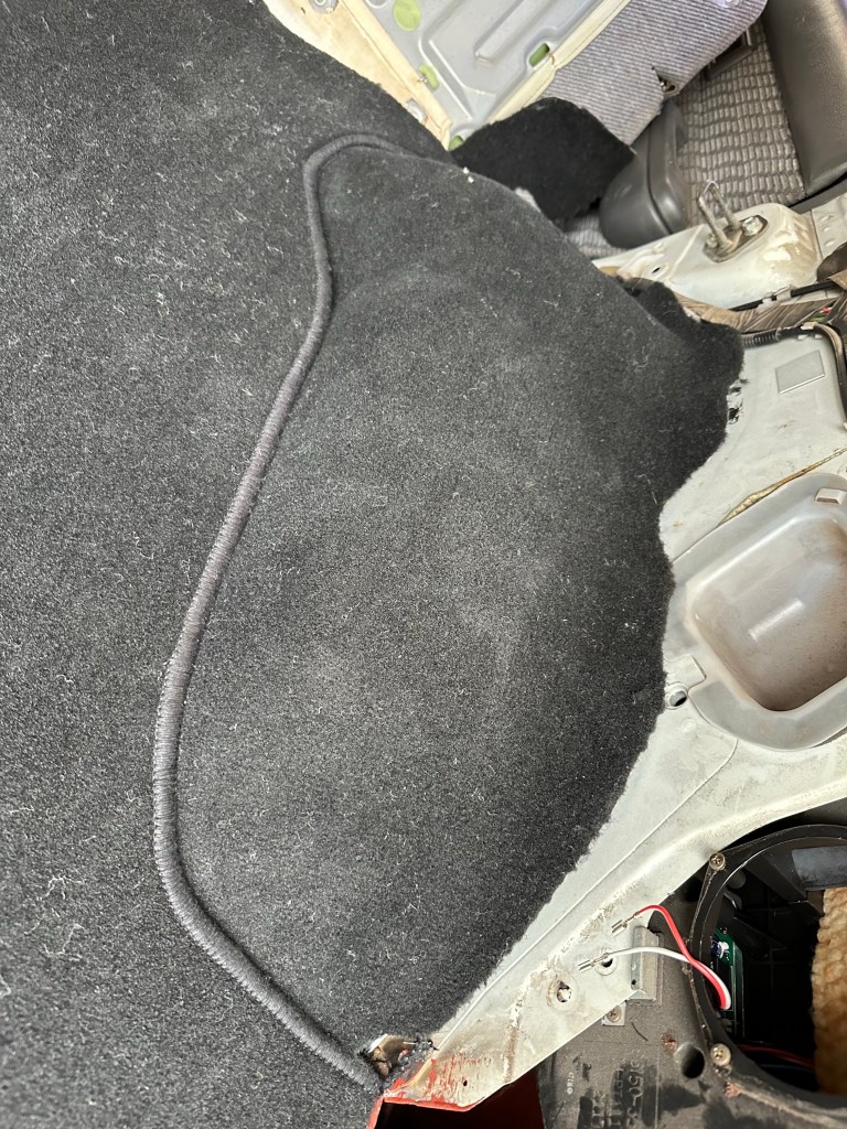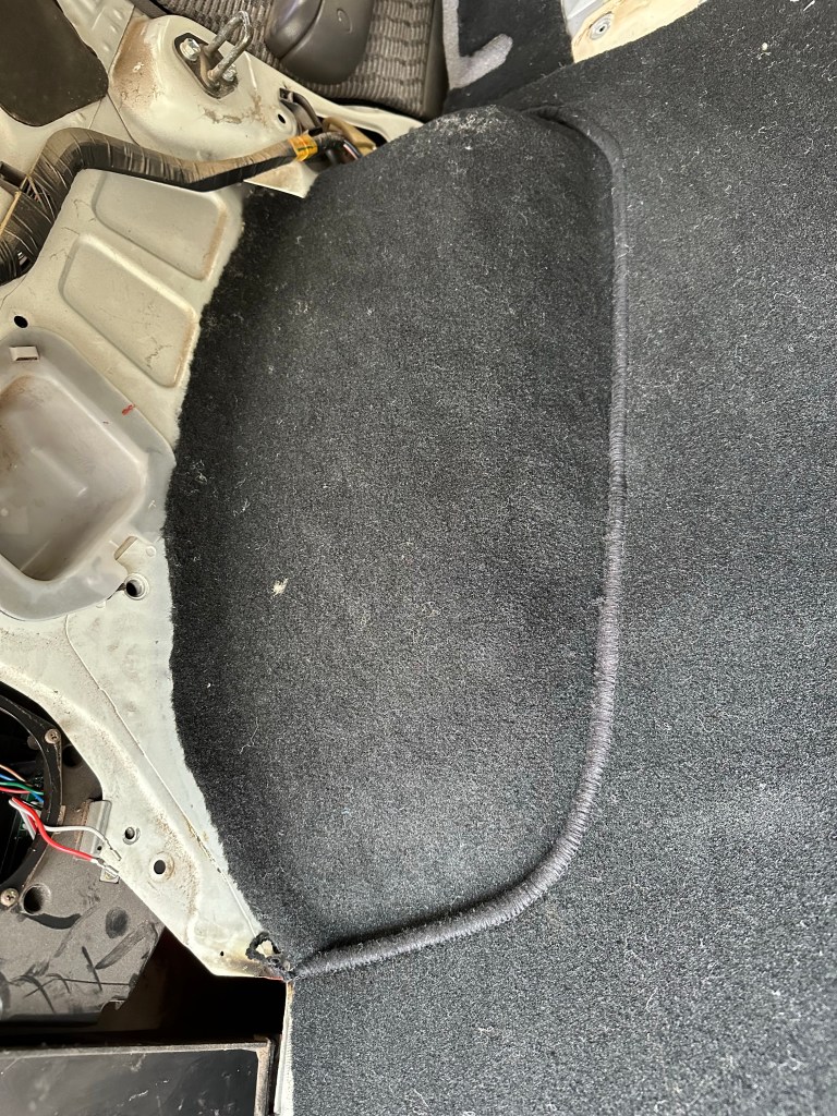 Starting at the Back and working forward, the Boot space gets the New Carpet first, and these Sections of Carpet were cut perfectly to fit so no Trimming required. Although I did need to cut openings for the Cargo Net Hoops; brought back memories of the 968.
