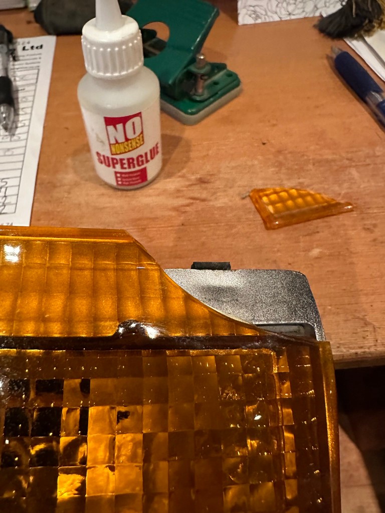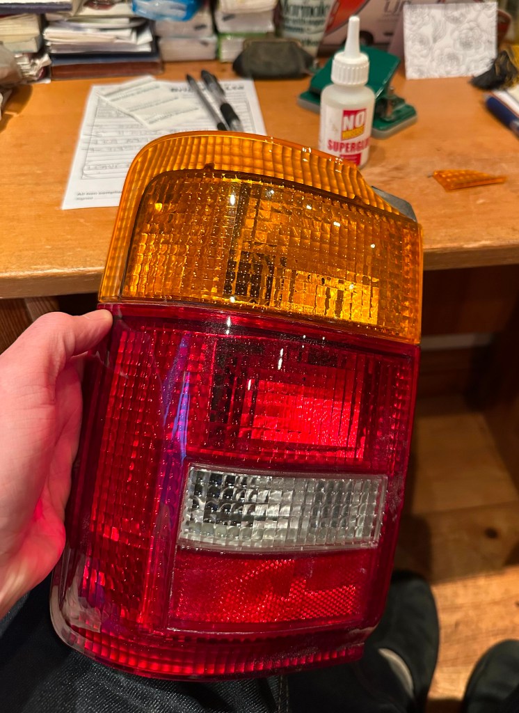 Whilst I was tidying up after the initial sanding down, I pulled at a sheet and something came flying out of it, flipping in the air and then missing everything soft to land on. Yep, a Rear Light Cluster.